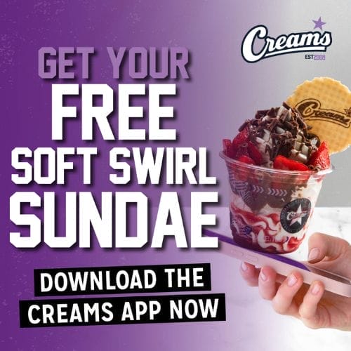 Creams offer delicious treats like milkshakes, waffles, bubble tea, cakes and more. If you download the Creams App and sign up with them, you can get a free Soft Swirl Sundae! There are different flavours of the sundaes available, but all feature soft ice cream with tasty toppings.
